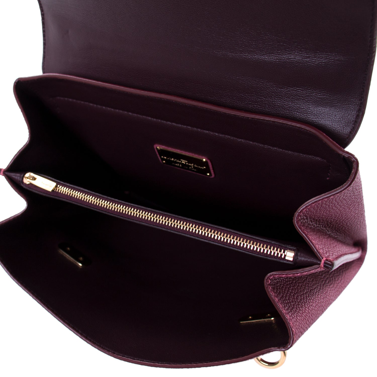 Details: Purple Grained Leather / Gold-Tone Hardware / Adjustable Shoulder Strap / Exterior Zipper Pocket at Back / Chocolate Leather Lining / Three Interior Compartments, One with Zip Closure / Dual Gancio Flip-Lock Closure at Front