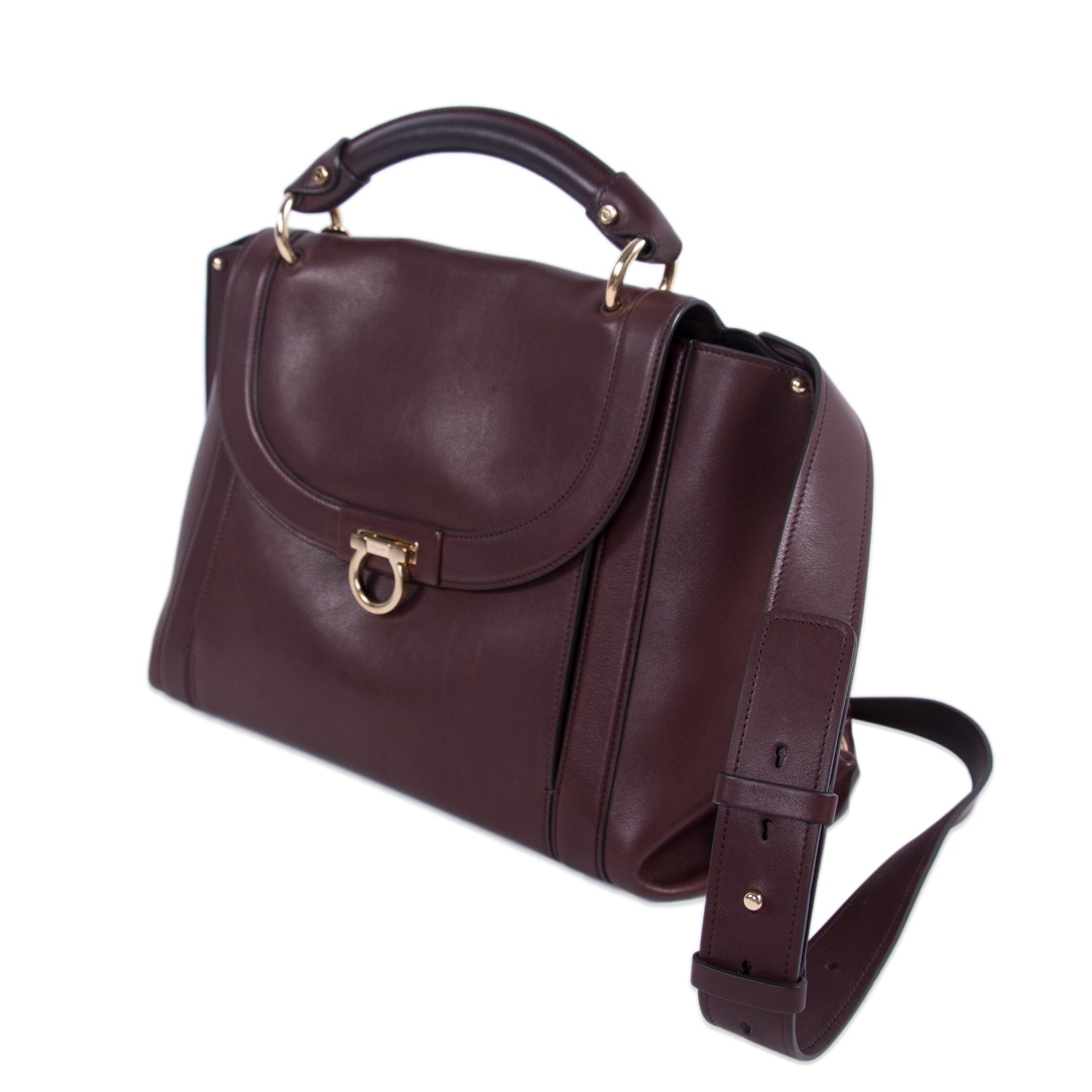 Details: Burgundy Calf Leather / Gold Tone Hardware / Single Handle / Detachable and Adjustable Shoulder Strap / Pocket at Back / Leather Interior Lining / Zipper and Flat Pocket at Inside / Flap Closure at Front