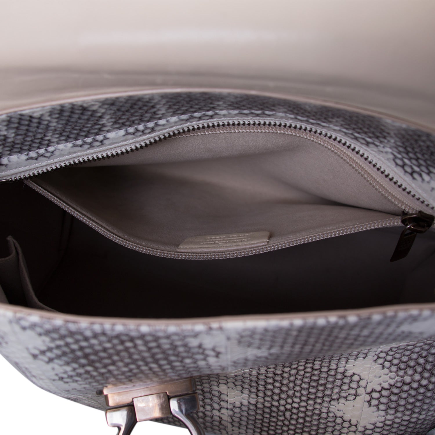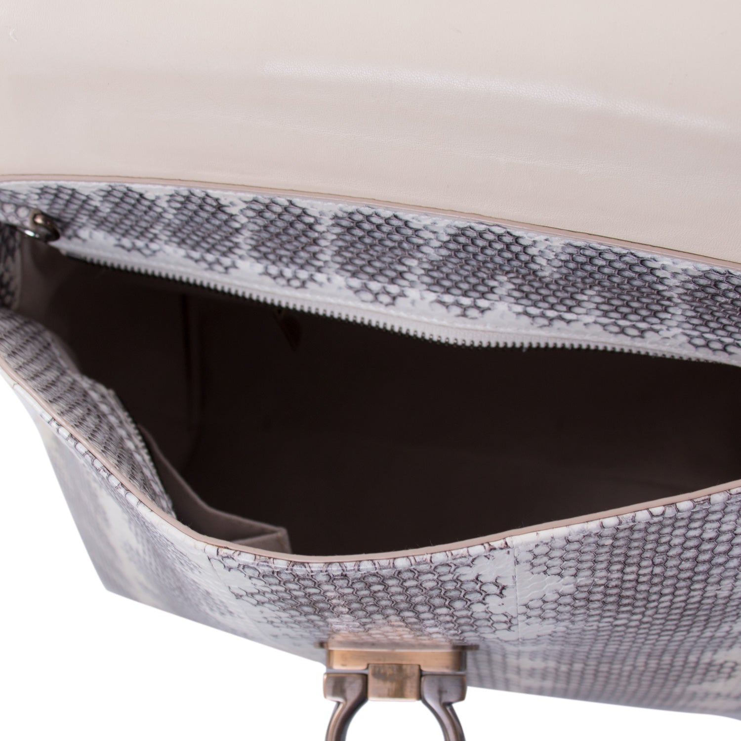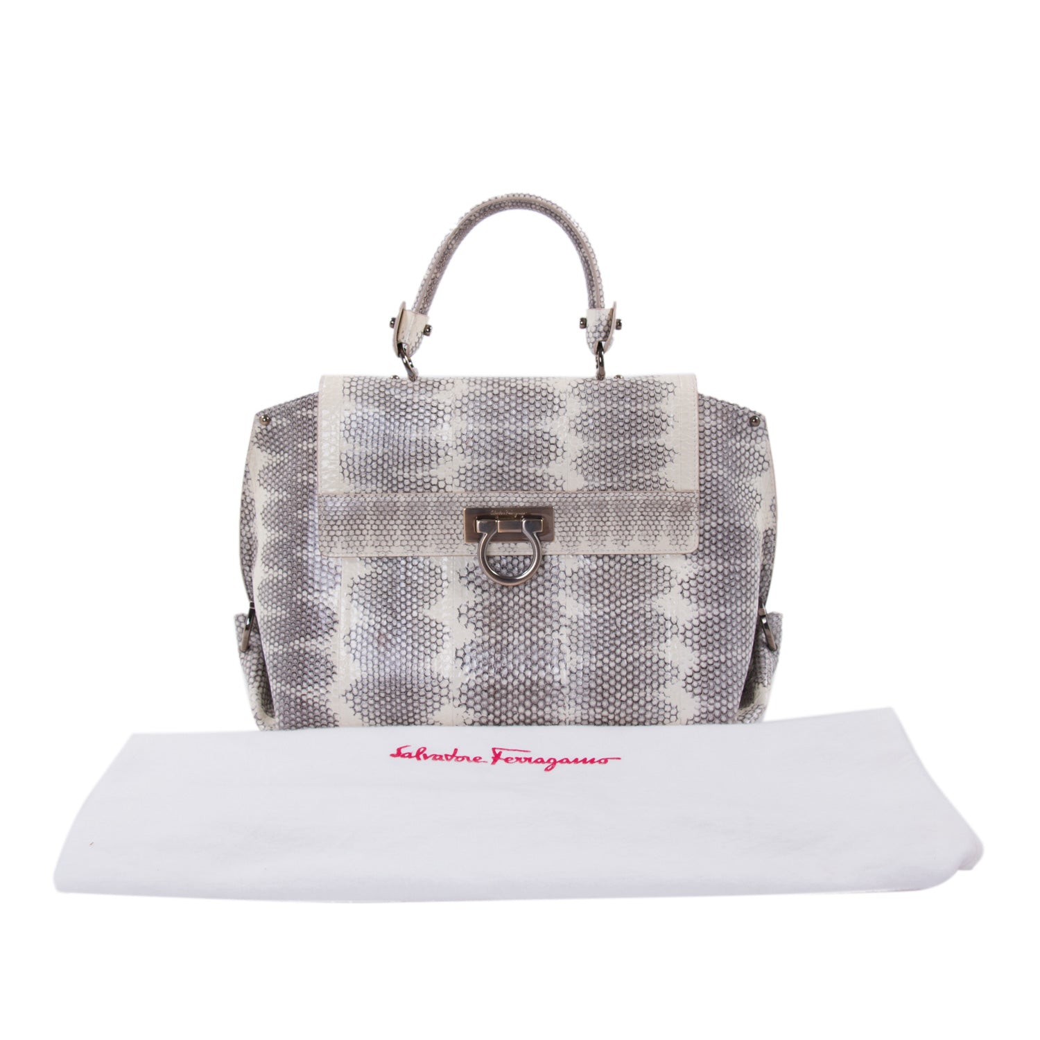 Details: White and Grey Snake Skin / Brushed Metal Hardware / Top Handle / Detachable Shoulder Strap / Suede and Leather Lining / Dual Slit Pockets and One Zipper Pocket at Inside / Gancino Flip-Lock Flap Closure