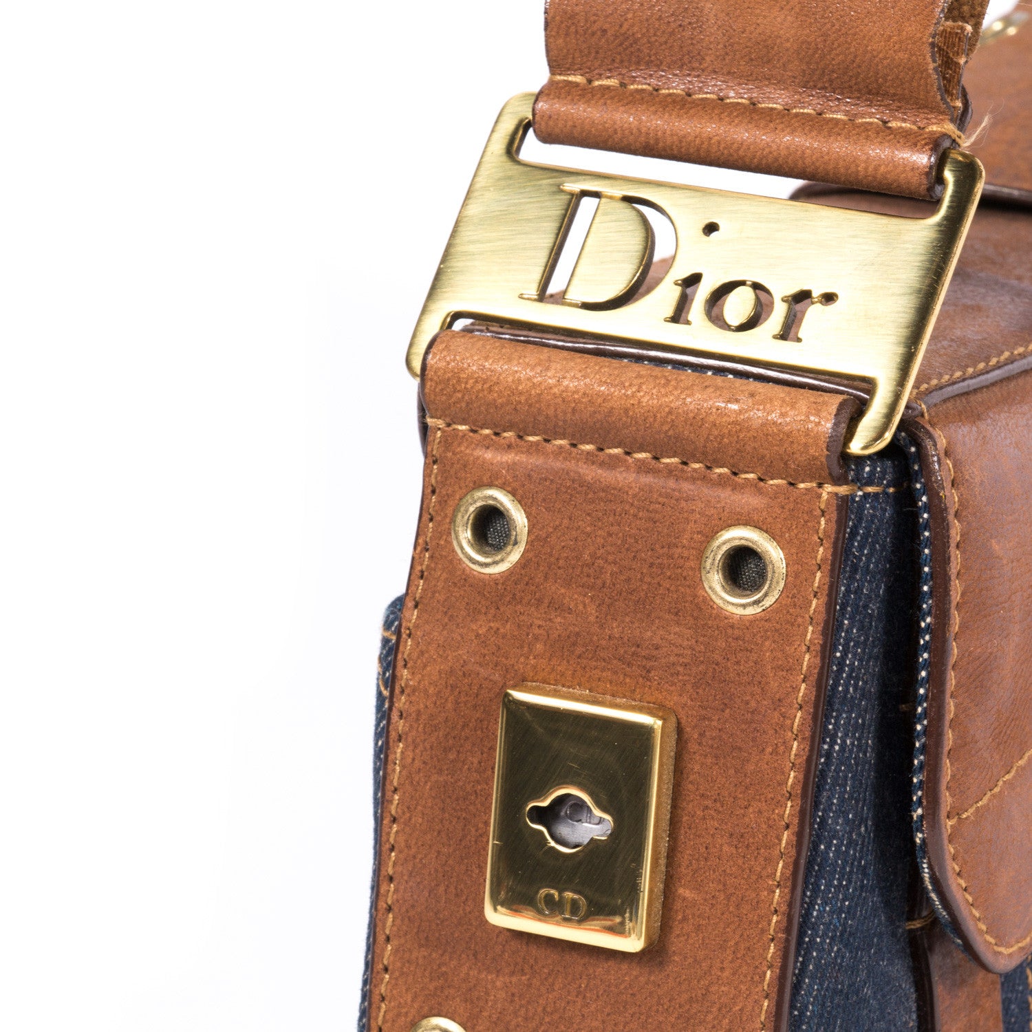 Details: Denim Fabric with Brown Leather / Gold-Tone Hardware / Adjustable Shoulder Strap / Metal Plate Logo at Front / Black Fabric Interior Lining / Zipper Pocket at Inside / Magnetic Flap Closure at Front