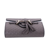 Details: Grey Guccissima Leather / Gold Tone Hardware / Shoulder Strap with Chain Link Accent and Leather Pad / Natural Canvas Interior Lining / Single Slit Pocket at Interior Wall / Fold-in Flap Closure at Front / Horse-bit and Tassel Embellishments at Front