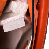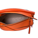 Details: Orange Leather / Gold-Tone Hardware / Single Flat Handle / Detachable Shoulder Strap / Exterior Zip Pocket at Back / Black Leather Accent Throughout / Beige Fabric Interior Lining / Dual Flat Pockets at Inside / Zipper Closure at Top with Small Flap