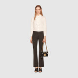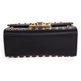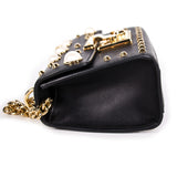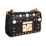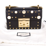 Details: Black Smooth Leather / Gold-Tone Hardware / Chain Shoulder Strap / Gold-Tone Studs and Glass GG Pearl Studs Embellishments at Front and Back /Beige Suede Lining / Single Compartment and Slit Pocket At Interior / Push-Button Closure at Front Flap