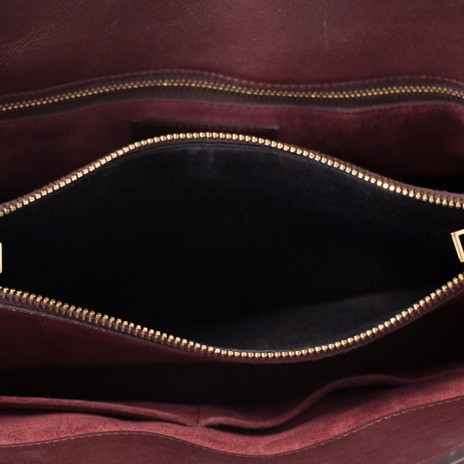 Details: Plum Leather / Small Size / Gold-Tone Hardware / Detachable Shoulder Strap / Dual Rolled Top Handles / Plum Suede Interior Lining / Three interior Compartments / One Compartment With Zip Closure One Top / One Compartment With Two Pockets At Interior Wall / One Compartment With Zip Closure At Interior Wall