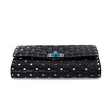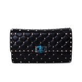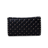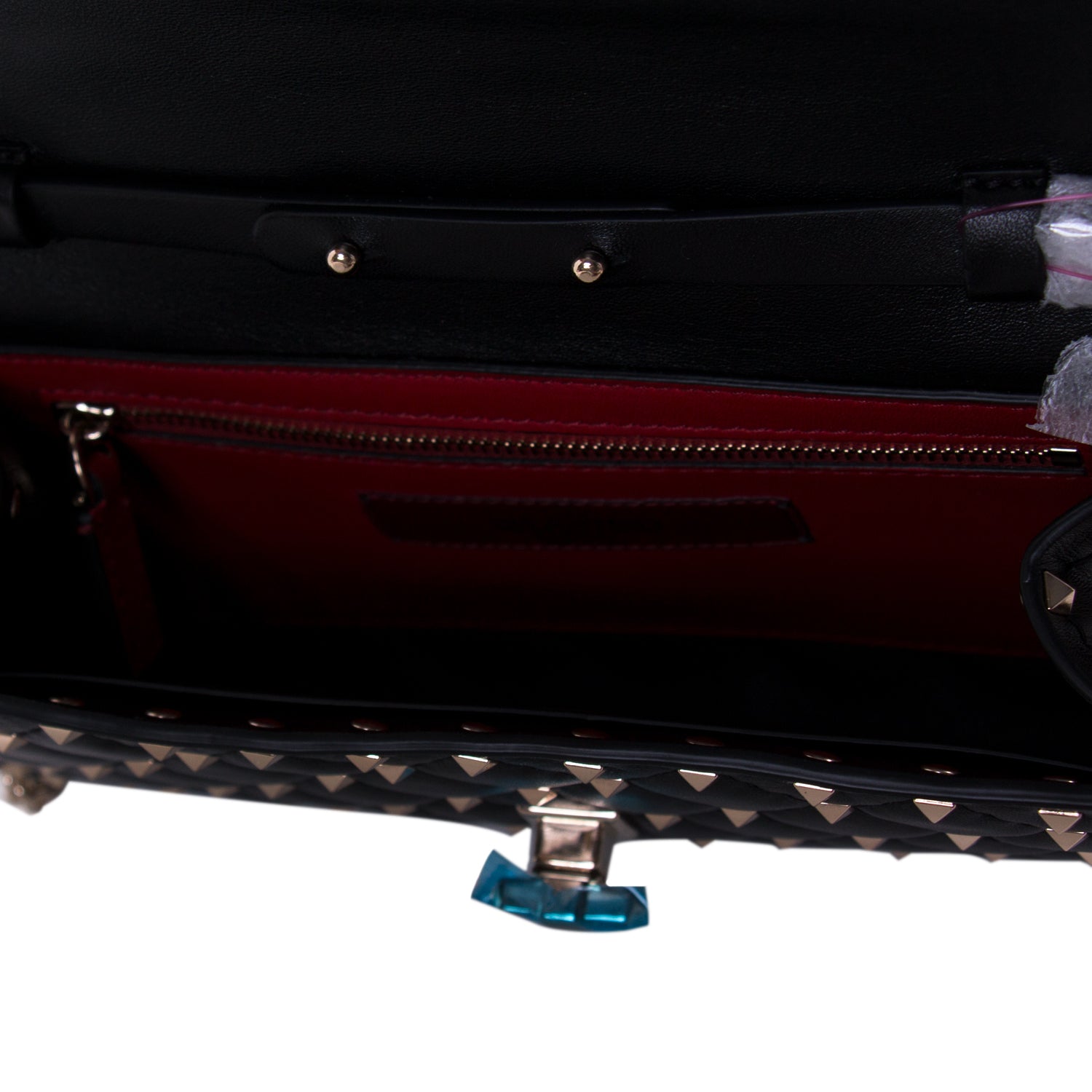 Details: Black Quilted Calf Leather / Gold-Tone Hardware / Detachable Chain-Link Shoulder Strap / Stud Embellishment Throughout / Black and Red Lining / Single Compartment with Zipper Closure / Ten Card Slots and One Bill Compartment / Turn-Lock Closure at Front Flap