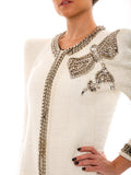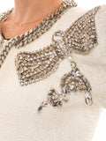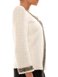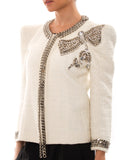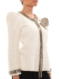 Details: White Cotton Linen / Exaggerated Shoulder Pads / Gunmetal Stud Embellished Trim / Frayed Edges / Hook Closure at Front / Metal Chain at Front and Neck / Three-Quarter Sleeve with Metal Chain / Crystal and Metal Embellishment on The Left Shoulder