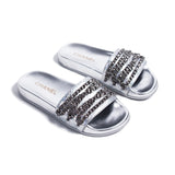 Details: Metallic Silver Leather / Silver-Tone Chain-Link Accent at Front / CC Charm / Rubber Sole