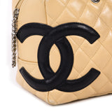 Details: Tan Calfskin Quilted Leather / Silver-Tone Hardware / Dual Black Rolled Leather Shoulder Strap / Interlocking CC Logo At Front / Slit Pocket At Exterior / Tonal Logo Jacquard Lining At Interior / Zip Pocket At Slit Pocket At Interior / Zip Closure At Top