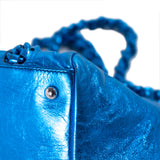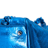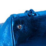 Details: Metallic Blue Leather / Metal Hardware / Chain-Link and Leather Shoulder Strap / Protective Studs at Base / Logo at Front Face / Grey Fabric Interior Lining / Dual Pockets at Interior one with Zipper Closure / Magnetic Snap Closure at Top