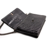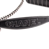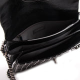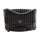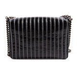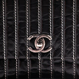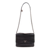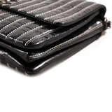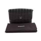Details: Black Patent Leather / Antiqued Silver Hardware / White Vertical Stitching Pattern / Dual Chain Shoulder Strap With Black Leather Pad / Grey Fabric Interior Lining / Three Compartments / Zip Closure at Interior Wall / CC Turn Lock Closure at Front Flap