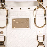 Details: White Quilted Leather / Gold-Tone Hardware / Dual Leather Rolled Handles / Gunmetal Studded Details Throughout / Interior Beige Satin Lining / Three Compartment, One With Zip Closure / Zip Pocket At Wall / Dual Flat Pockets At Interior Wal / Magnetic Snap Closure At Top