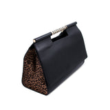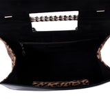 Details: Black Soft Leather / Gold-Tone Hardware / Leather Top Handle / Enamel Bar Handle / Logo at Back / Protective Feet at Base / Leopard Print Pony Hair at Sides / Black Suede Lining / Zip and Push Button Pocket / Flap Closure