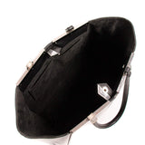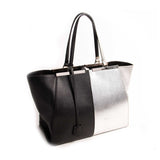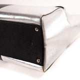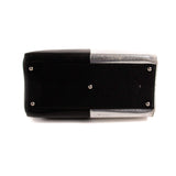 Details: Black and Sliver Metallic Leather / Silver-Tone Hardware / Dual Rolled Handles / Protective Studs at Base / Black Suede Interior Lining / One Compartment / Dual Flat and One Zipper Pockets at Inside / Snap Closure at Top