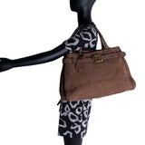 Details: Brown Suede / Gold-Tone Hardware / Dual Rolled Handles / GG Metal Logo at Front Face / Large Compartment / Beige Canvas Interior Lining / Dual Phone Pockets and One Zip Pocket / Magnetic Snap Closure at Top
