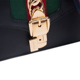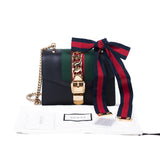 Details: Black Smooth Leather / Gold-Tone Hardware / Grosgrain Sylvie Web Bow with Gold-Ton Ends with Stars / Metal Chain on Top of the Green and Red Web Fabric Detail / Chain Shoulder Strap / Suede Interior Lining / One Compartment and Flat Pocket at Inside / Buckle Closure at Front Flap