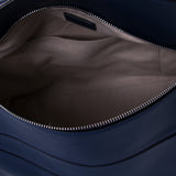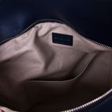 Details: Navy Blue Leather / Silver-Tone Hardware / Single Flat Handle / Detachable Shoulder Strap / Exterior Zip Pocket at Back / Black Leather Trim Throughout / Beige Fabric Interior Lining / Dual Flat Pockets at Inside / Zipper Closure at Top with Small Flap