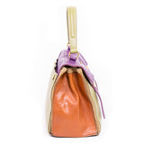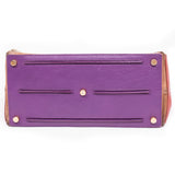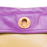 Details: Green, Brown, and Purple Leather / Gold-Tone Hardware / Pocket at Back with Button Closure / Beige Woven Interior Lining / Three Interior Compartments / Zip Closure / Push-Lock Closure at Front Face