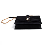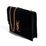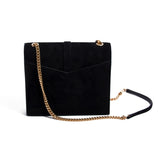 Details: Black Suede / Gold-Tone Hardware / Chain Shoulder Strap with Pad / Logo at Front / Black Leather Interior Lining / Flat Front at Back Pocket / Slit Interior Pocket / Double Flap with Magnetic Closure