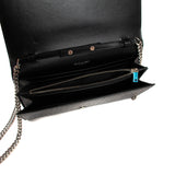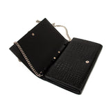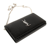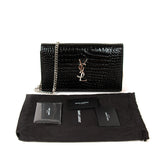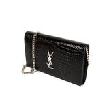 Details: Black Crocodile Embossed Leather / Silver-Tone Hardware / Black Leather Trim / Adjustable Shoulder Strap / Logo at Front / Black Leather Interior / Three Compartments One with Zipper / 20 Card Slots / Two Flat Pocket / Push Button Closure at Front