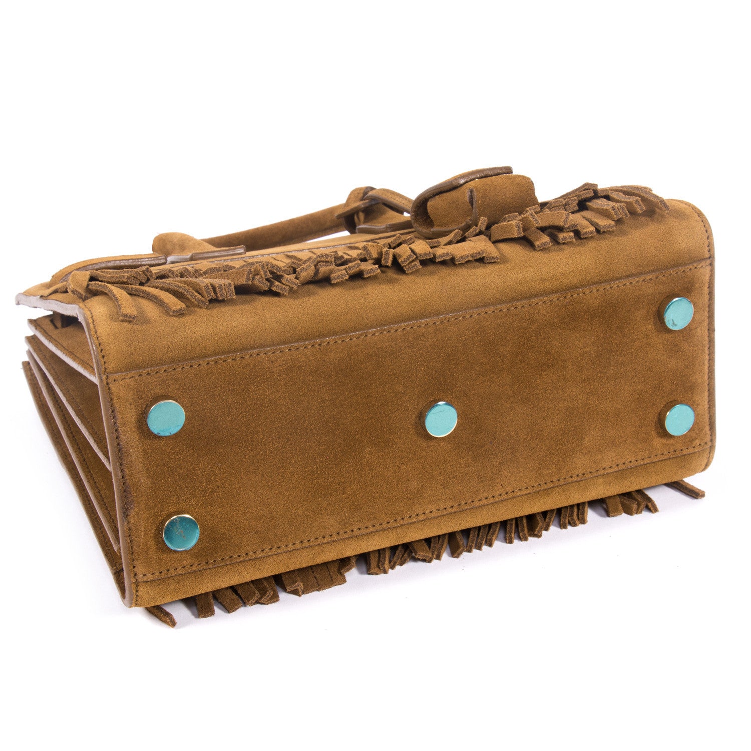 Details: Tan Brown Suede With Fringes / Gold Tone Hardware / Dainty Dual Top Rolled Handles / Adjustable Detachable Shoulder Strap / Black Interior Calf Leather Lining / Open Top / Protective Studs At Base / Single Compartment With Slit Pocket