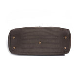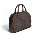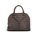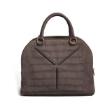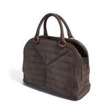 Details: Dark Green Crocodile Embossed Suede / Brass Hardware / Dual Rolled Handles / Protective Studs at Base / Three Compartments with Zippers / Single Zip Pocket at Inside