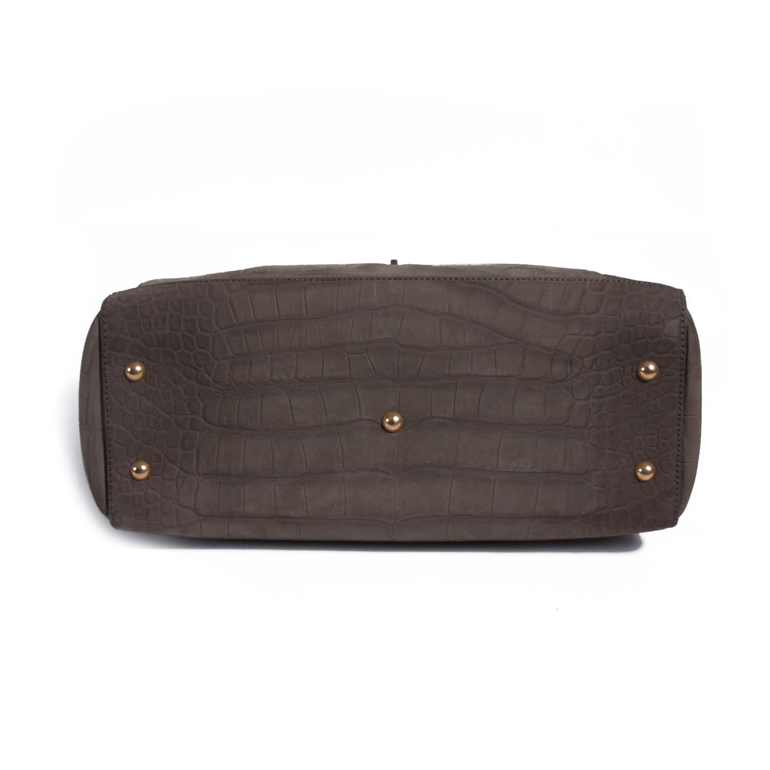 Details: Dark Green Crocodile Embossed Suede / Brass Hardware / Dual Rolled Handles / Protective Studs at Base / Three Compartments with Zippers / Single Zip Pocket at Inside