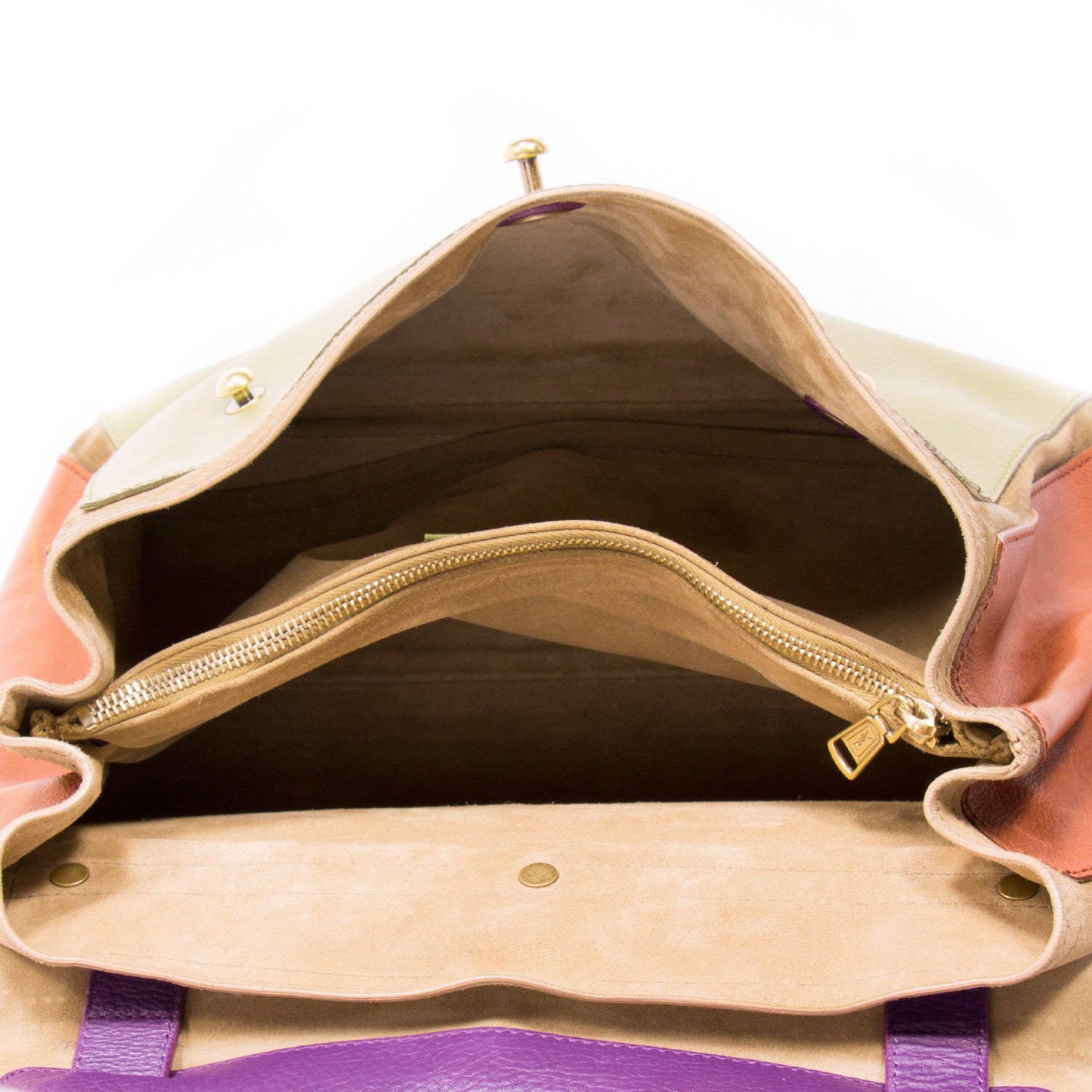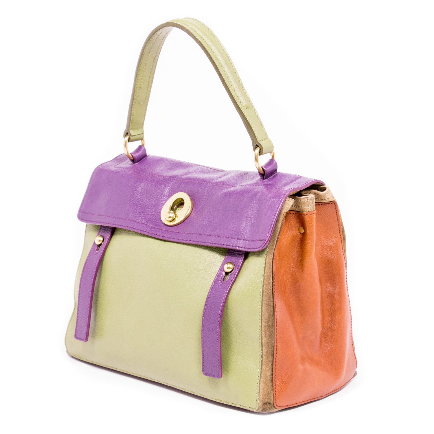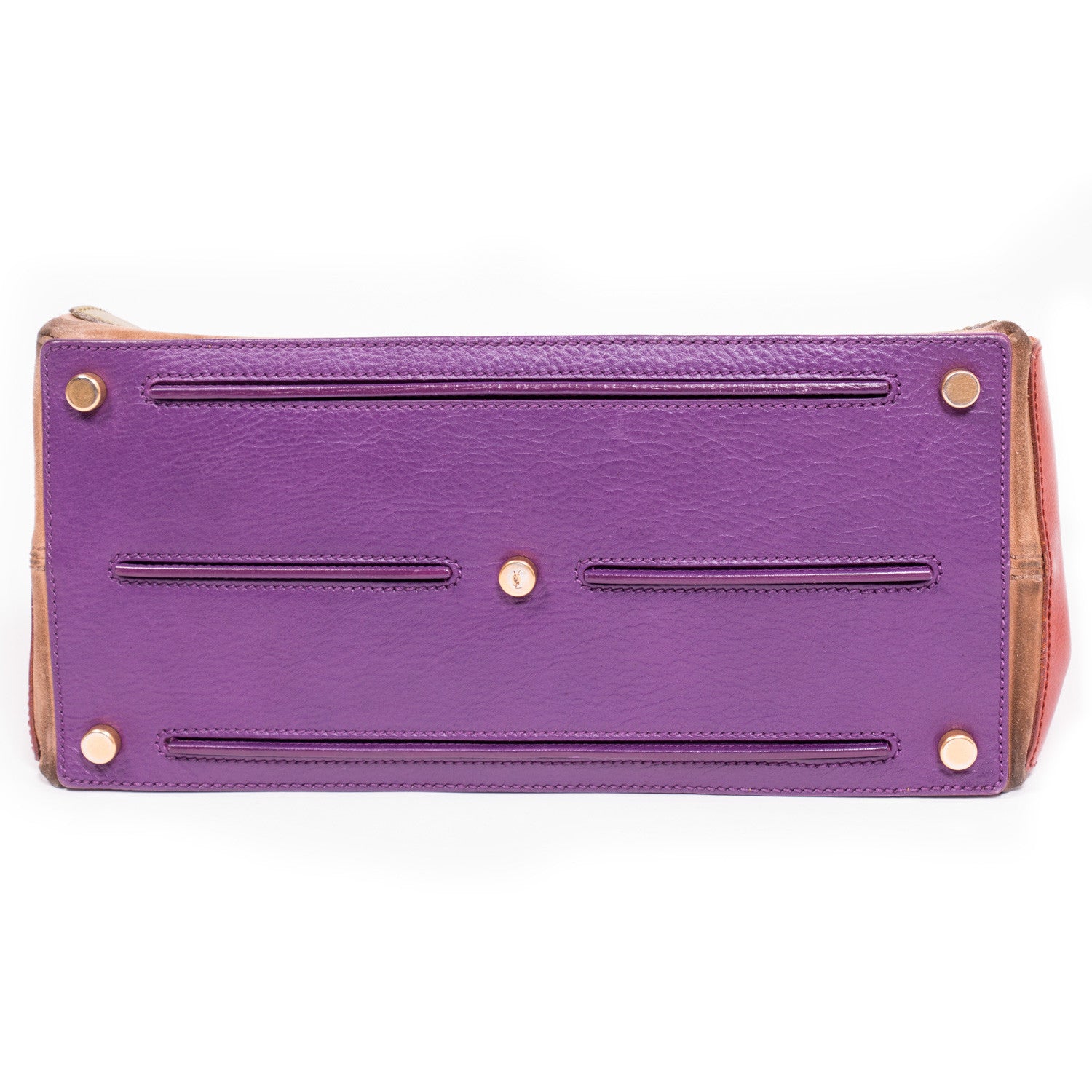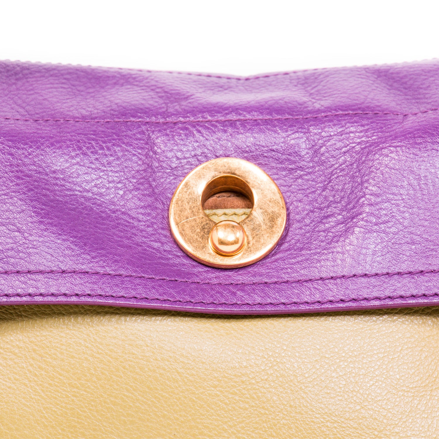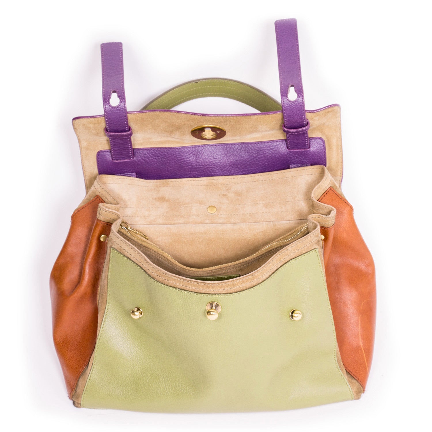 Details: Green, Brown, and Purple Leather / Gold-Tone Hardware / Pocket at Back with Button Closure / Beige Woven Interior Lining / Three Interior Compartments / Zip Closure / Push-Lock Closure at Front Face