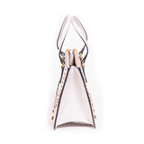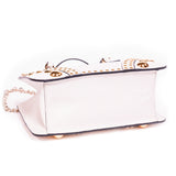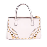 Details: White Saffiano Leather / Faceted Gold Dome Studs / Gold Tone Hardware / Dual Flat Top Handles / 4" Drop / Two Exterior Front And Back Zip Pockets Frame Open Top / Leather Triangle With Gold Logo Lettering / Black Leather Interior Lining With Single Zip Inside and Single Open Pocket / Chain For Shoulder