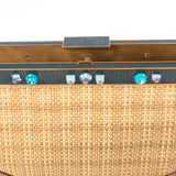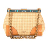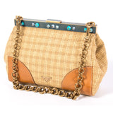Details: Tan Raffia Prada Paglia Cocco Shoulder Bag / Gold-Tone Brass Hardware / Camel Leather Trim Featuring Contrasting Stitching / Chain-Link Shoulder Strap / Blue Metal Accent At Frame With Pearl Embellishment / Blue Leather Interior lining / Single Large Compartment With Zip Closure Pock / Push-Lock Closure At Top