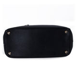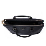 Details: Black Saffiano Leather / Gold-Tone Hardware / Dual Rolled Handles / Detachable Shoulder Strap / Three Compartments, Two with Zipper Closure / 3 Pockets at Inside, One with Zipper.