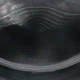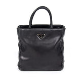 Details: Black Prada Tote / Silver Tone Hardware / Tonal Stitching / Logo At Front / Dual Rolled Top Handles / Black Logo Print Woven Lining / Three Compartment, One / Zipper Pocket At Interior Wall